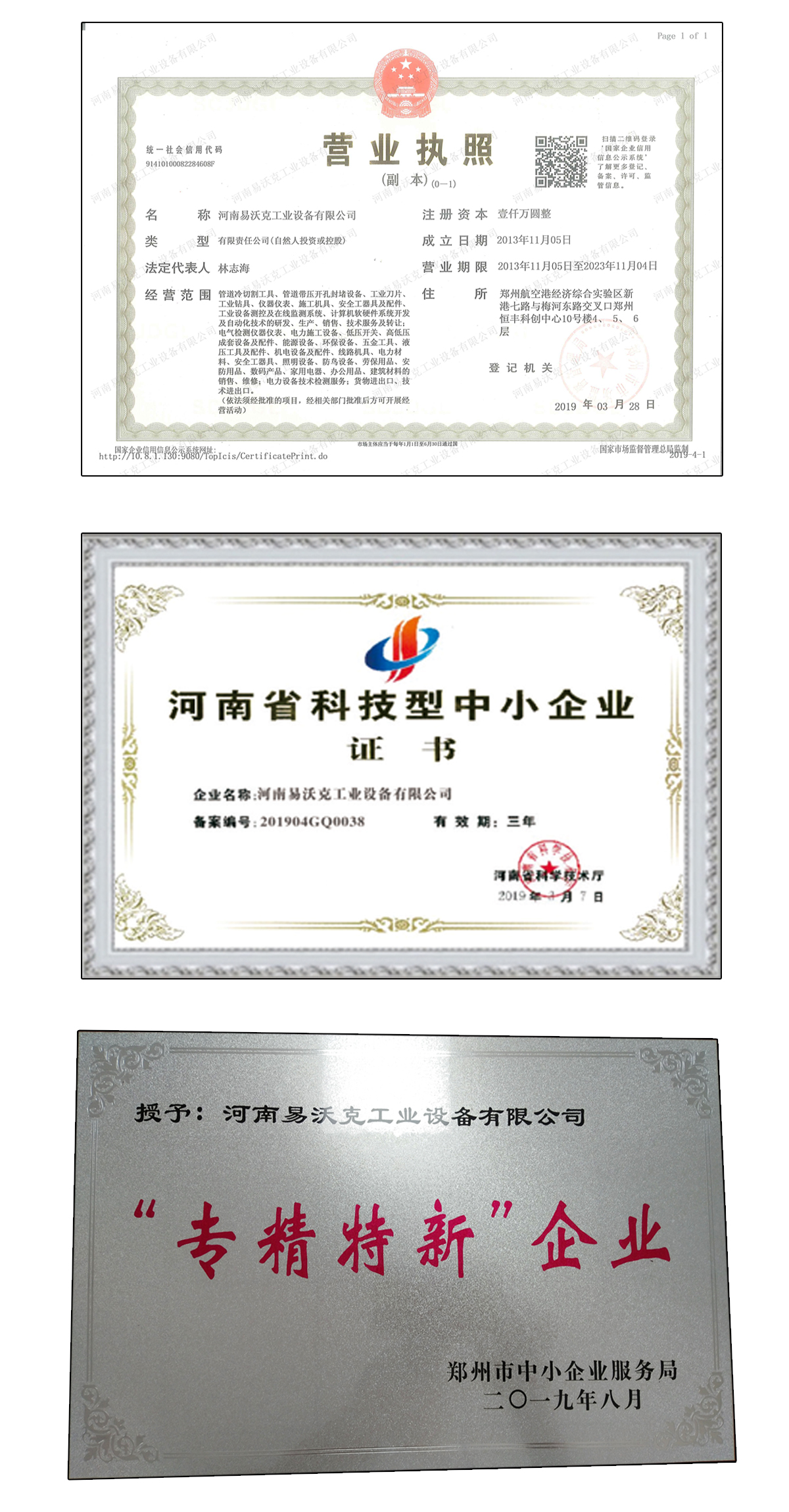 易沃克營業執照,科技型中小企業證書,“專精特新”企業,易沃克榮獲重質量守信用企業、重合同守信用企業、重服務守信用企業,誠信經營示范單位、誠信供應商企業證書、企業資信等級證書。