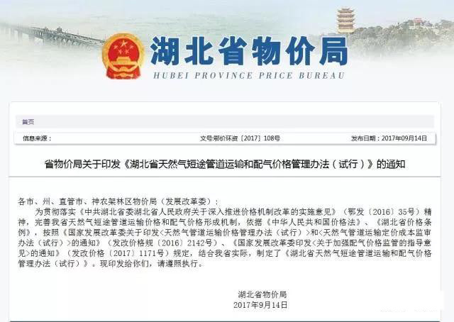 2017年發改委《關于核定天然氣跨省管道運輸價格的通知》,根據《天然氣管道運輸價格管理辦法(試行)》和《天然氣管道運輸定價成本監審辦法(試行)》有關規定,對中石油北京天然氣管道有限公司等13家跨省管道運輸企業進行了定價成本監審,核定了中石油北京天然氣管道有限公司等13家跨省管道運輸企業管道運輸價格。自2017年9月1日起執行。